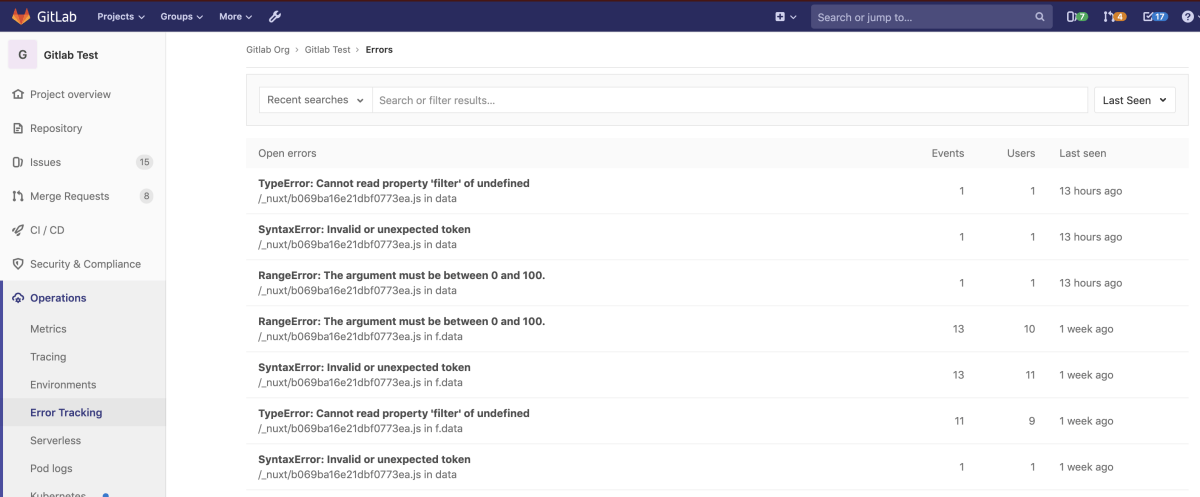 You can find the Error Tracking list at Operations > Error Tracking in your project's sidebar. Here, you can filter errors by title or by status (one of Ignored , Resolved, or Unresolved) and sort in descending order by Frequency, First Seen, or Last Seen. By default, the error list is ordered by Last Seen and filtered to Unresolved errors.